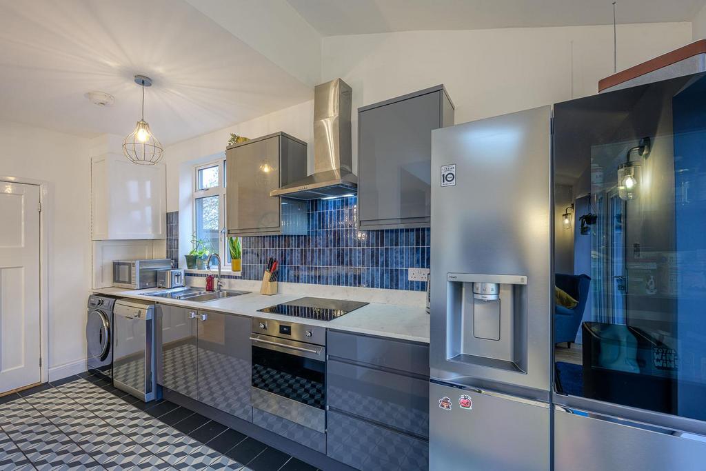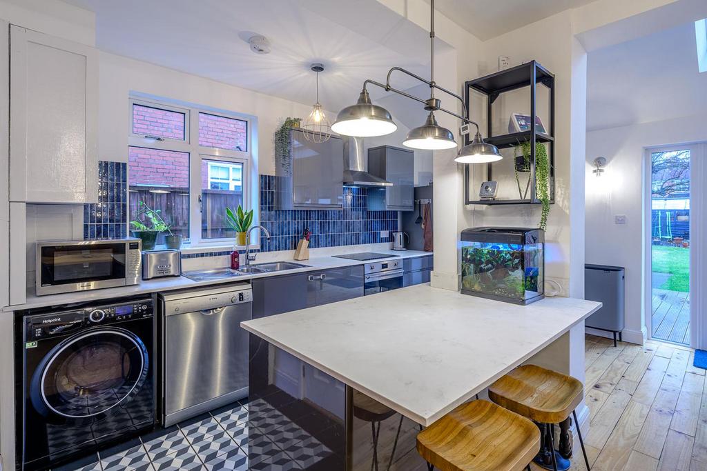 Kitchen Dining Room - 6.02 x 4.88 (19'9" x 16'0") - With a door leading from the entrance hall, tiled floor, range of fitted wall and base units, work surfaces over with matching upstands and tiled splash back, one and a half bowl stainless steel sink and drainer, integrated oven with induction hob and stainless streel cooker hood above, plumbing for dishwasher and washing machine, space for tall fridge freezer, centre island with overhang seating, opening to dining area and snug, skylight window, double glazed window to side and rear and double glazed french doors to garden.