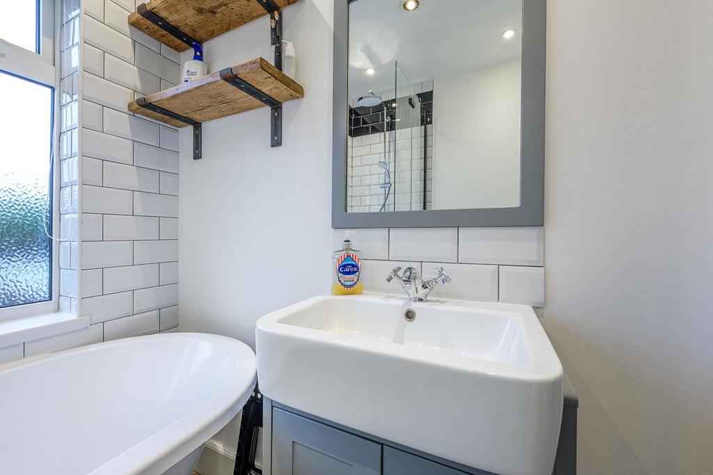 Bathroom - 1.71 x 1.79 (5'7" x 5'10") - With a door leading from the landing, WC, wash hand basin set into vanity unit, bath with waterfall shower over and separate shower attachment, recessed spotlights, double glazed window to rear and a central heating radiator.