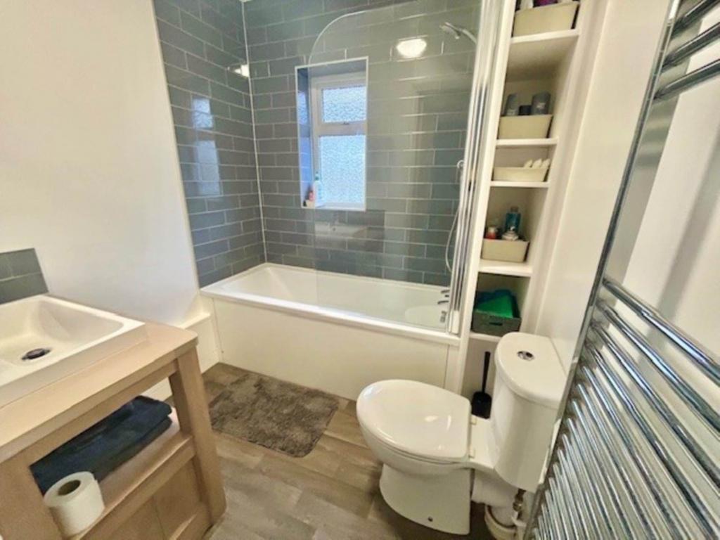 A modern white suite comprising panelled bath with independent shower and glazed screen, modern grey-tiled bath area, double-glazed window, low-level WC, contemporary wash basin with mixer tap on bespoke handmade oak unit with shelving, shaver point, chromium ladder-style towel rail, extractor fan and pine door.