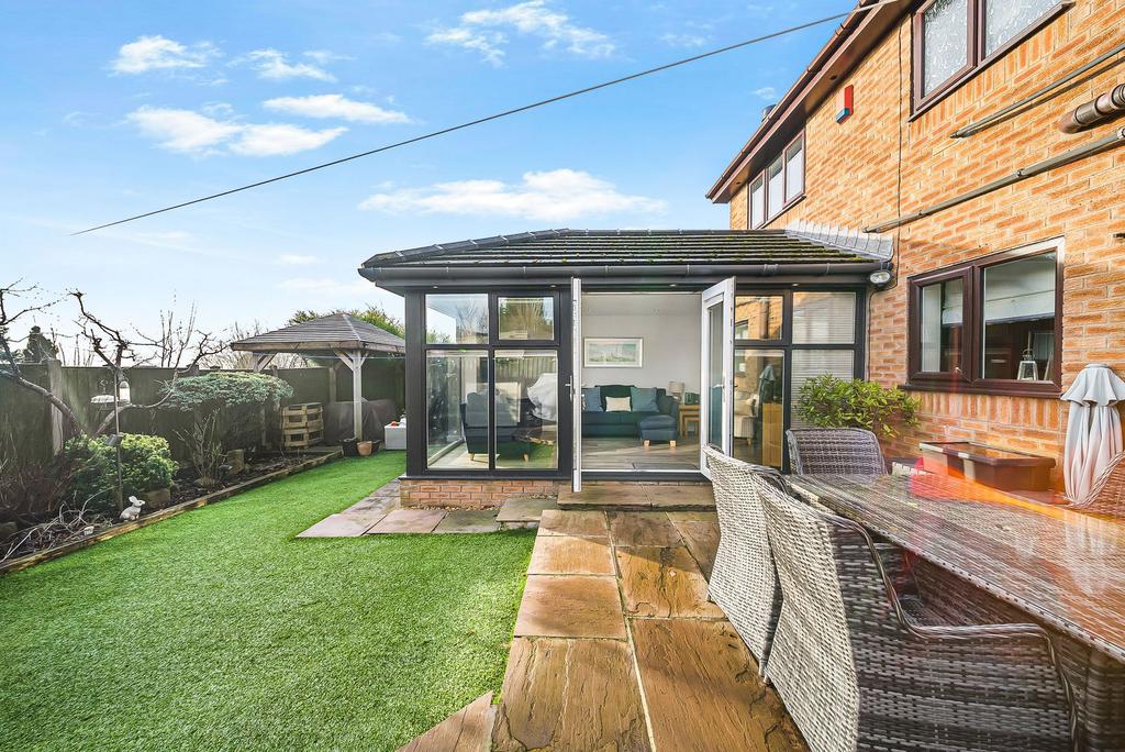 The property boasts four double bedrooms, with the master suite featuring a modern en-suite. Downstairs, the home has been thoughtfully extended to create a stunning open-plan kitchen, dining, and living space, seamlessly flowing into an orangery extension that floods the space with natural light. The dining area is enhanced by an impressive modern wood-burning stove, creating a warm and inviting focal point.