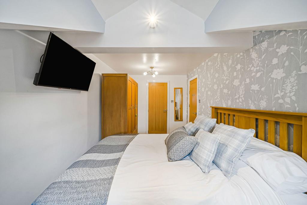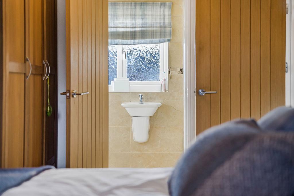 The master bedroom features a wall-mounted TV point, UPVC double-glazed window, central heating radiator, and an en-suite bathroom with a fully tiled three-piece suite, corner shower, sink with vanity, WC, spotlights, extractor, and towel radiator.