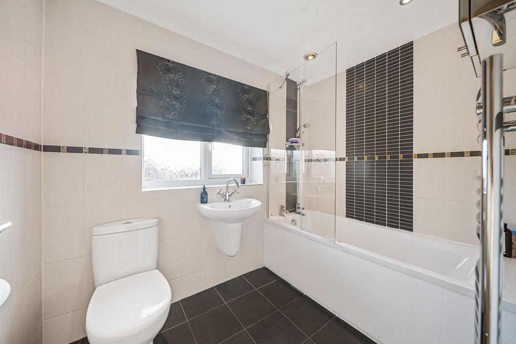The main family bathroom is fully tiled and features a three-piece suite, bath with overhead shower, WC, sink, spotlights, extractor, UPVC double-glazed window, towel rail, and shower screen.