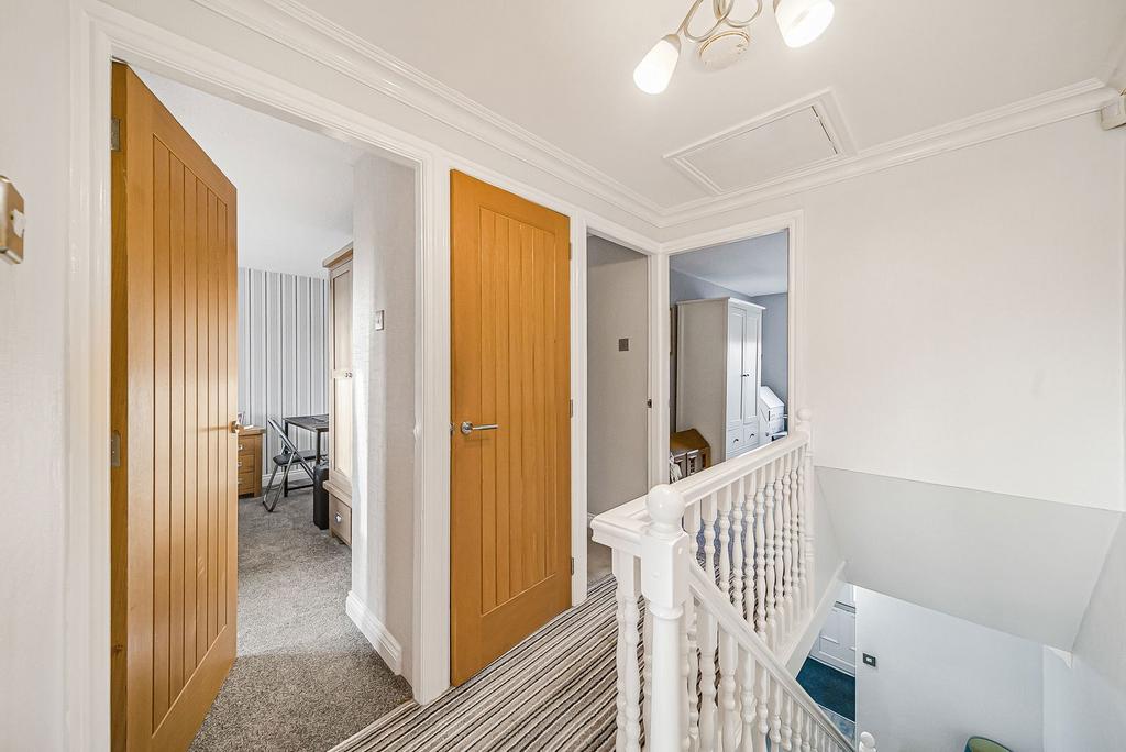 The landing provides access to four double bedrooms, the family bathroom, a storage cupboard, and loft access, with coving and a smoke alarm.