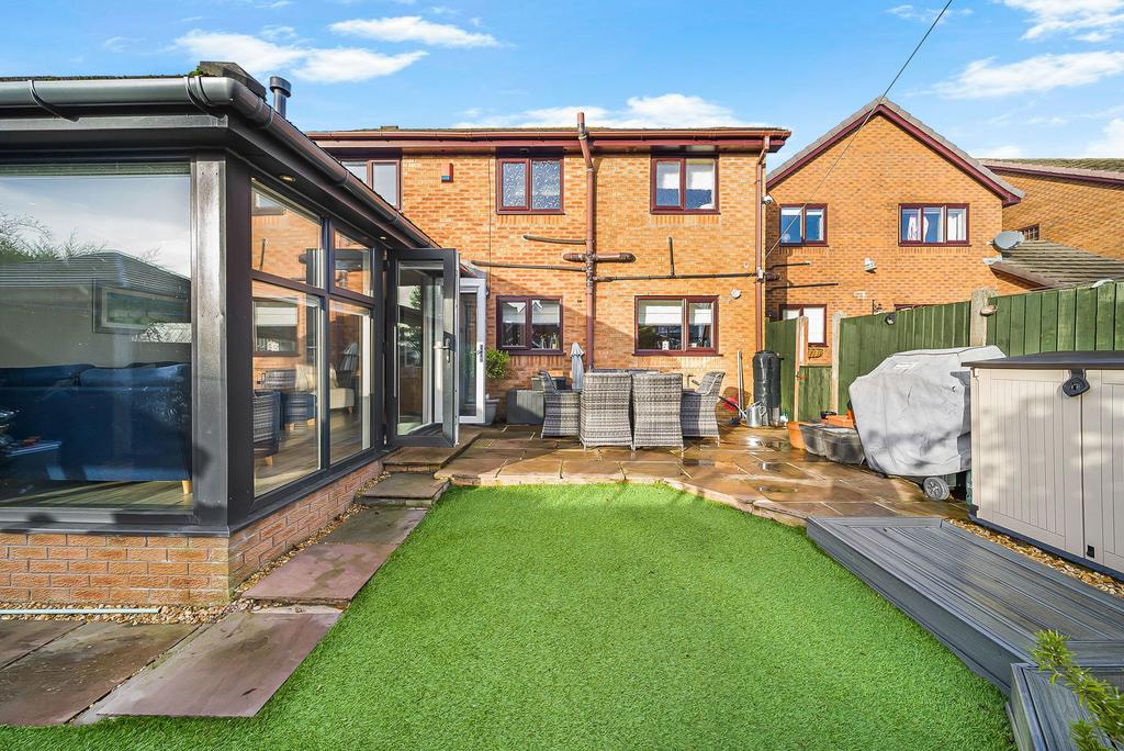 The rear garden is private and beautifully landscaped, featuring an Indian stone flagged patio, raised composite decking area, flower beds with mature shrubs and trees, artificial grass, and a third seating area with a pagola. The side of the property provides a flagged area with multiple storage sheds, plus outside power and water supply.