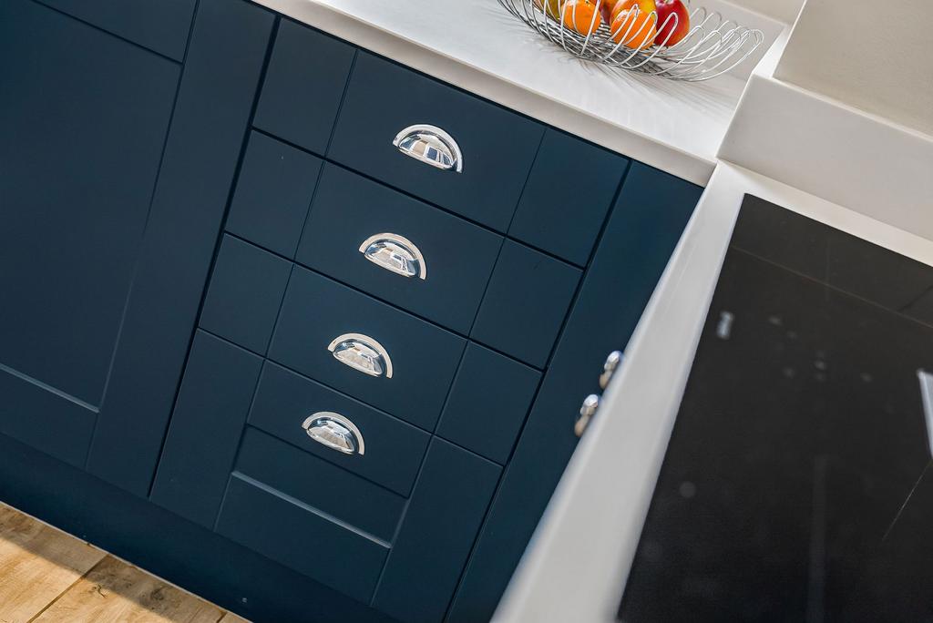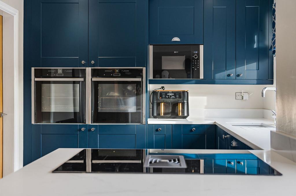 The kitchen has a tiled floor, spotlights, and two UPVC double-glazed windows, with space for an American fridge. It is fitted with blue wall and base units, quartz worktops, Neff double oven, Neff microwave, Faber induction hob with built-in extractor, integrated dishwasher, hot tap, and a sink with drainer built into the worktop.