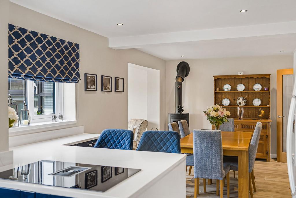 The property boasts a large open-plan kitchen-dining-family space, which also flows into the orangery extension. The dining area features a multifuel burning stove on a stone hearth, spotlights, tiled floor, and a central heating radiator, creating a cosy and inviting space.
