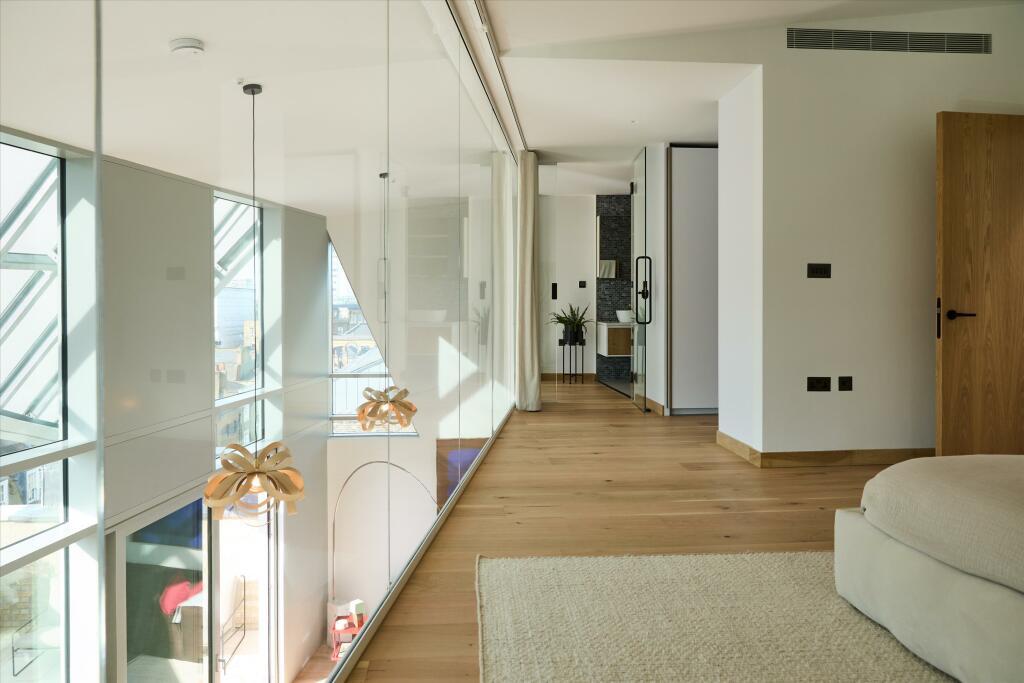 The exclusive Penthouse at Arclight Lofts is an impressive and unique apartment configured over two floors, featuring a soaring double height primary living space flooded with natural light from the floor-to-ceiling glazed facade. Sliding glazed doors open to a connected private terrace, offering exceptional east-to-west panoramic views over the surrounding streets and rooftops of Covent Garden and Seven Dials. From the mezzanine level above, the principal bedroom suite offers a calming space with commanding views, a generous separate dressing area and contemporary en suite bathroom.