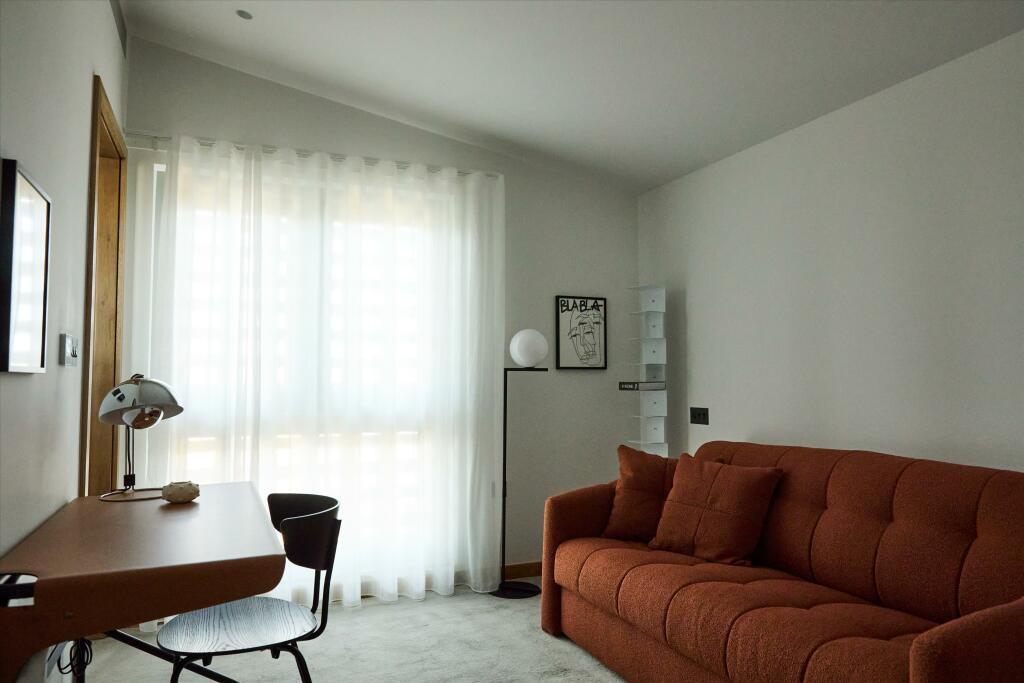 Light-filled bedrooms feature double-glazed, thermally efficient steel windows, wool blend carpets, and built-in double-sized wardrobes. The clean, architectural lines of the bathrooms are complemented by warm natural tones of Bluestone tumbled-marble-mosaic wall tiles and contemporary brass Hansgrohe fittings.