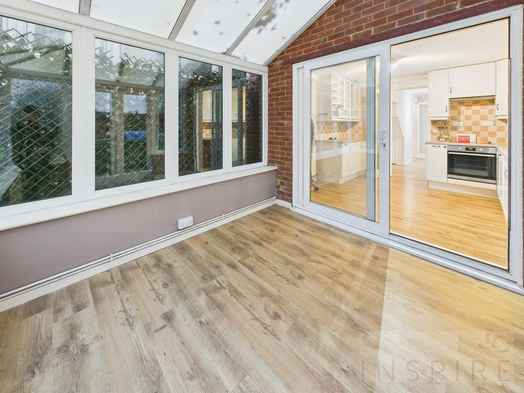 This beautifully presented two-bedroom terraced house offers contemporary living with a functional and stylish layout, ideal for modern lifestyles. The ground floor welcomes you with an open-plan kitchen and living area that flows seamlessly into a bright conservatory. The kitchen is equipped with sleek white cabinetry, integrated appliances, and ample counter space, enhanced by attractive wooden and laminate flooring. The adjoining conservatory, bathed in natural light from large windows and sliding glass doors, extends the living space and provides direct access to the private garden. Upstairs, two well-proportioned bedrooms feature built-in wardrobes and storage solutions, offering plenty of space for organisation. Large windows throughout both the bedrooms and living areas allow for abundant natural light, creating a warm and inviting atmosphere. The modern family bathroom is finished with white tiled walls, a full-length bath-tub with overhead and handheld showers, and contemporary fixtures, all complemented by wood-effect and laminate flooring for a fresh, clean look.