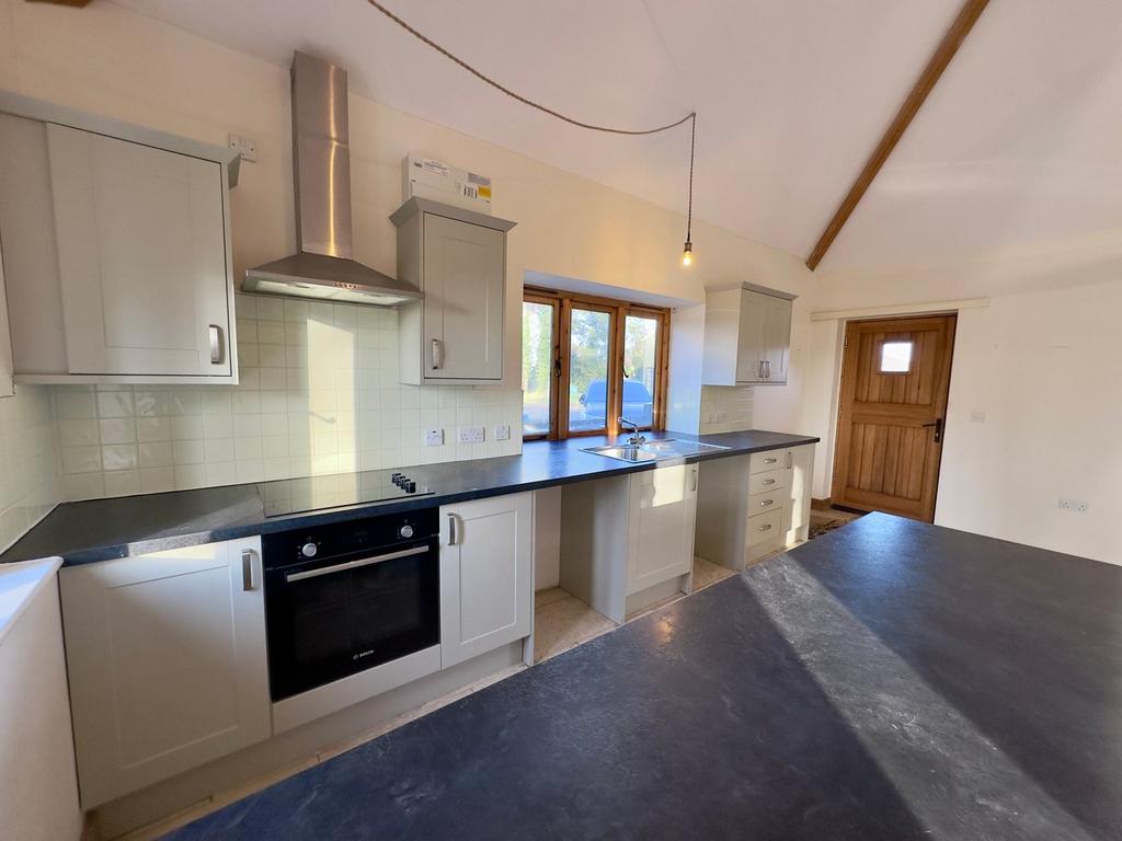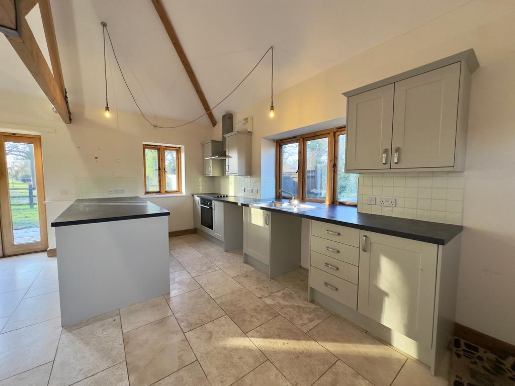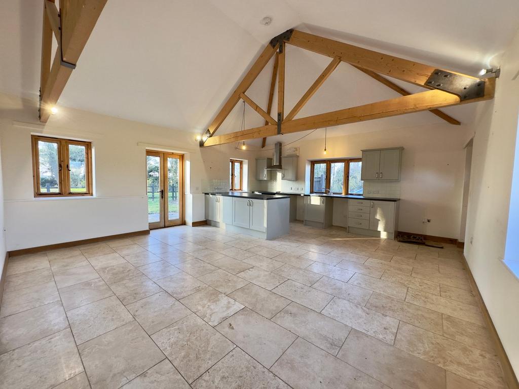 The kitchen area is well appointed with modern units, ample worktop space and an island ideal for both food preparation and casual dining. Dual-aspect windows and glazed doors allow plenty of natural light while offering pleasant views over the surrounding countryside.