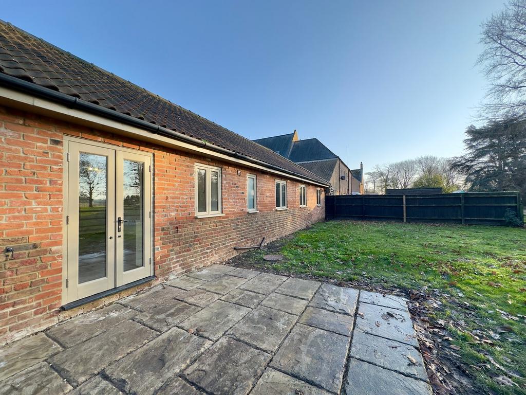 French doors open from the accommodation onto the patio, creating a seamless connection between indoor and outdoor living. The garden is bordered by fencing and mature trees beyond, enhancing the peaceful setting and making this an excellent space to enjoy the surrounding countryside.