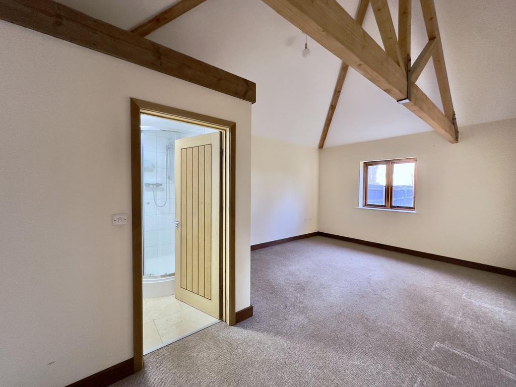 A further well-proportioned bedroom presented in neutral tones and fitted with carpet throughout. The room features a vaulted ceiling with an exposed timber beam, adding character and a sense of height.