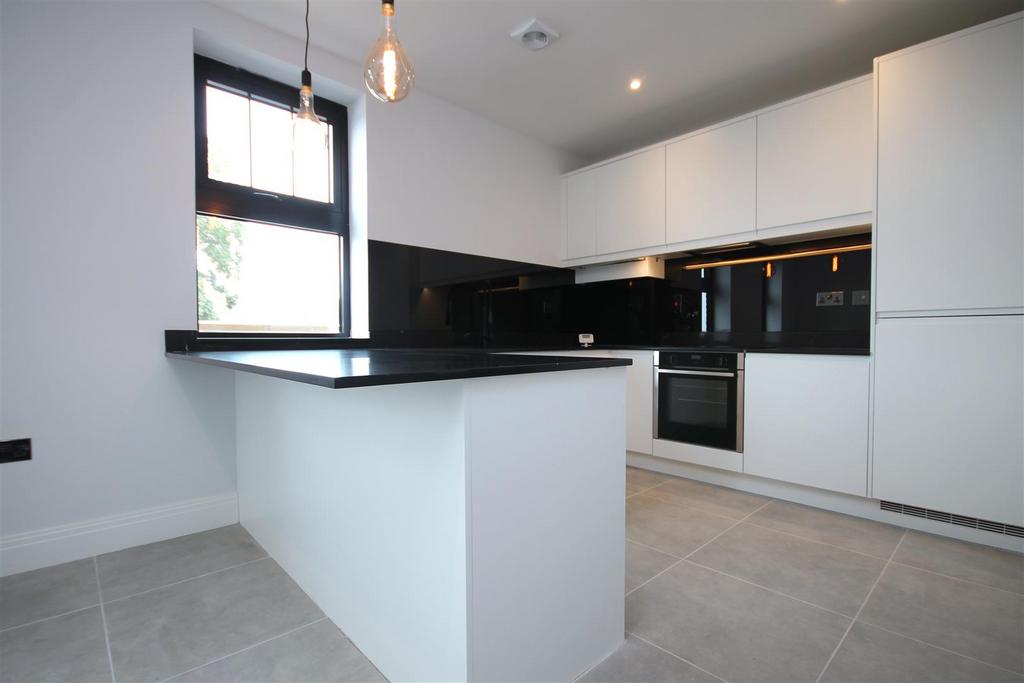 Kitchen - The kitchen units are white with contrasting black quartz worktops and a peninsula unit offering storage as well as breakfast bar seating on the far side.