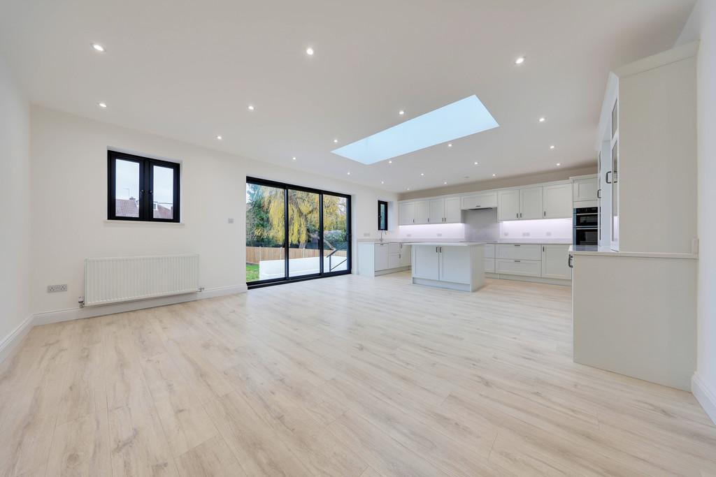 KITCHEN/DINER 25' 07" x 19' 09" (7.8m x 6.02m) Range of matching wall and base units with Grade 1 quartz worktops over, butler sink, central island, integrated oven and grill, integrated induction hob with extractor over, integrated tower fridge, integrated tower freezer, integrated dishwasher, integrated wine fridge, double glazed windows to rear, double glazed sliding door to rear, sky lantern, LVT flooring, two radiators.