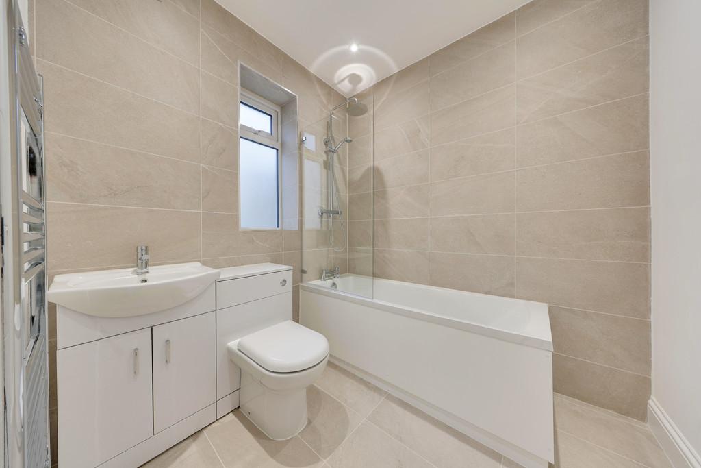 EN-SUITE BATHROOM Low level WC, wash hand basin in vanity unit, bath with shower over and shower attachment, double glazed opaque window to side, tiled flooring, heated towel rail.