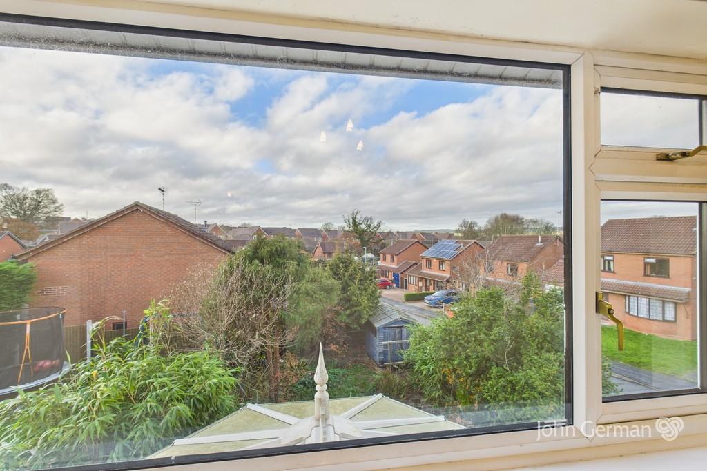 To the first floor, the landing has a built-in airing cupboard housing the hot water cylinder and loft hatch. Doors open to the three bedrooms, two of which can easily accommodate a double bed, with the rear facing master extending to the width of the home, with fitted wardrobes and a far-reaching view. Completing the accommodation is the fitted bathroom which has a white modern suite with tiled splashbacks, incorporating a panelled bath with an electric shower over, and a side facing window providing natural light.