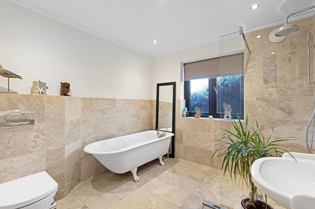 The family bathroom is larger than average and fitted with a four-piece suite, including a roll-top bath and separate walk-in shower, offering both comfort and practicality.