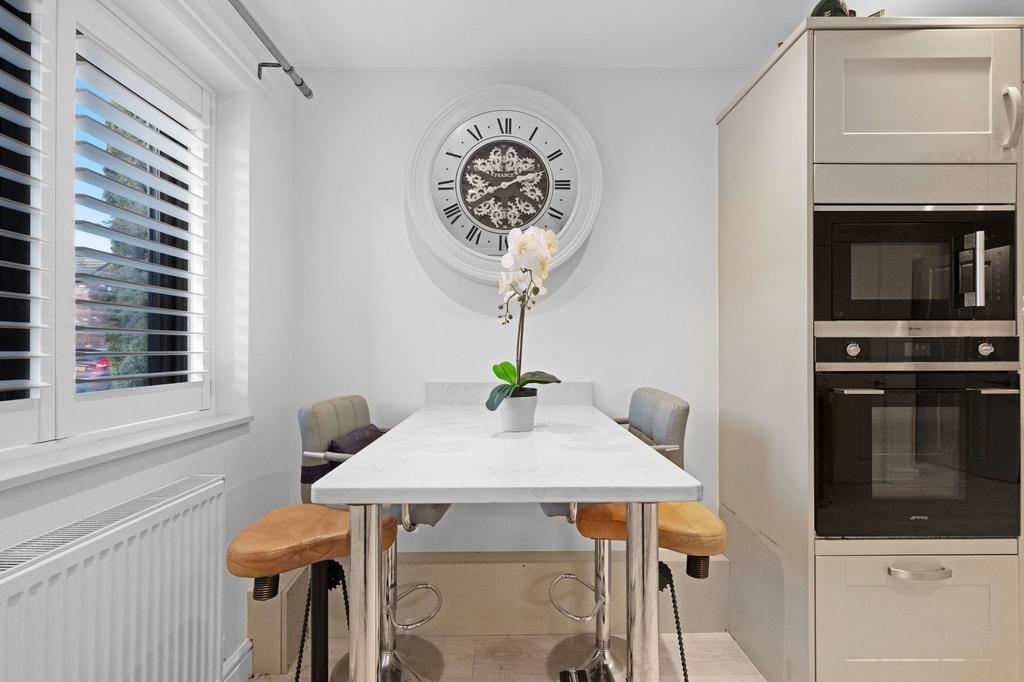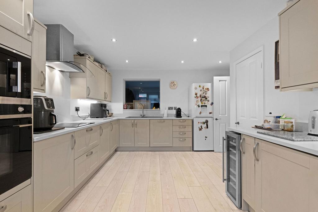 Adjacent to the lounge sits the kitchen diner, fitted with classic shaker-style units, quartz worktops and integrated appliances. Windows to both the front and rear elevations keep the room light and airy, while useful storage, including an under-stairs cupboard, helps keep the space organised and clutter-free.