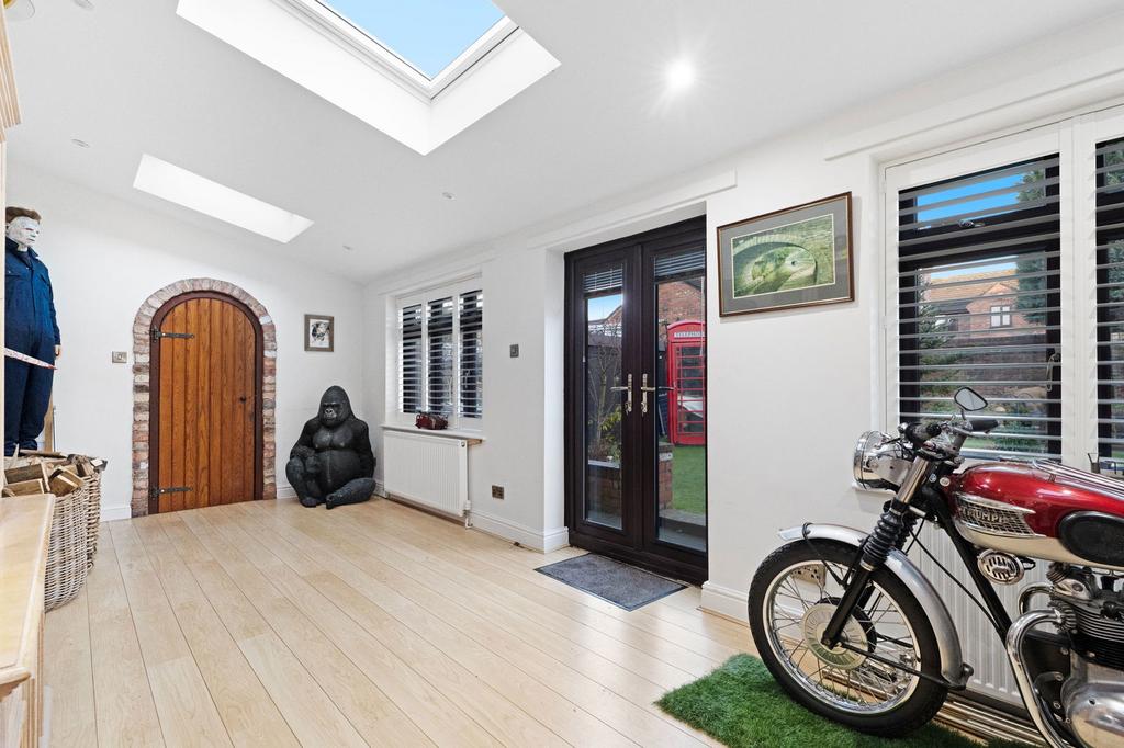 The family room is bright and versatile, featuring Velux windows and patio doors opening directly onto the rear garden. It works equally well as an additional sitting room, playroom or informal entertaining space and offers direct access to the utility room and integral garage — a layout that suits everyday family life.