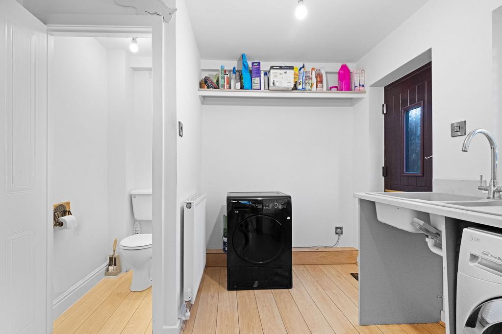 The utility room provides space for laundry appliances and incorporates a downstairs WC, neatly tucked away and practical for busy households. A stable door leads directly out to the rear garden, adding to the home’s day-to-day practicalities.