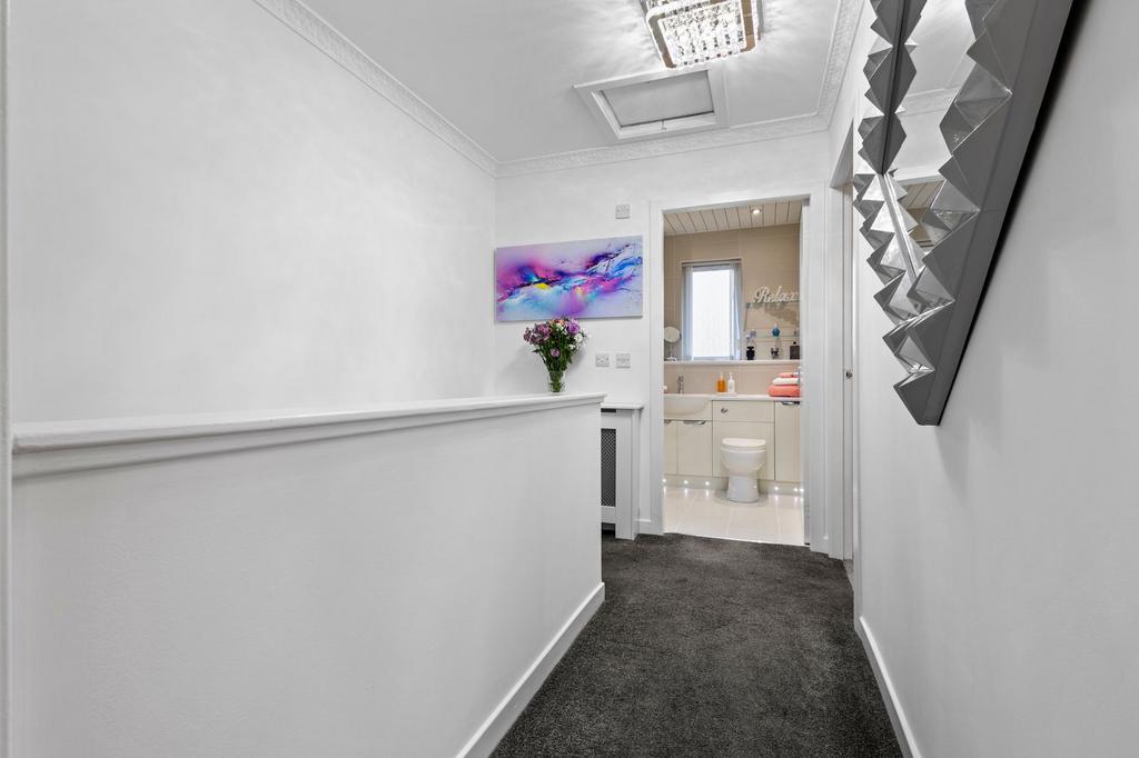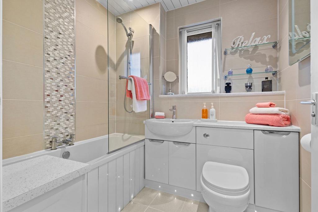Ascending to the first floor, a bright landing provides entry to two well-proportioned double bedrooms. The principal bedroom enjoys the luxury of a modern en-suite shower room with contemporary fittings including shower cubicle, wash basin, and WC. The second bedroom offers excellent accommodation for family members or guests. The stylish family bathroom features a white three-piece suite with bath, mixer shower over, wash basin, and WC, complete with full tiling and PVC clad ceiling for easy maintenance.