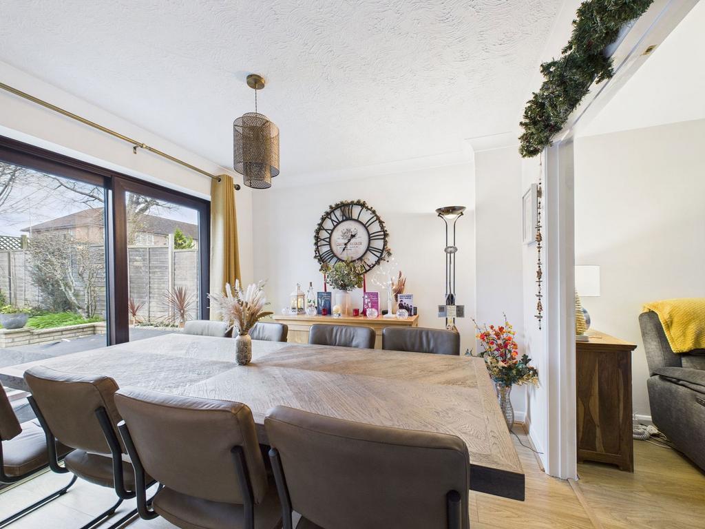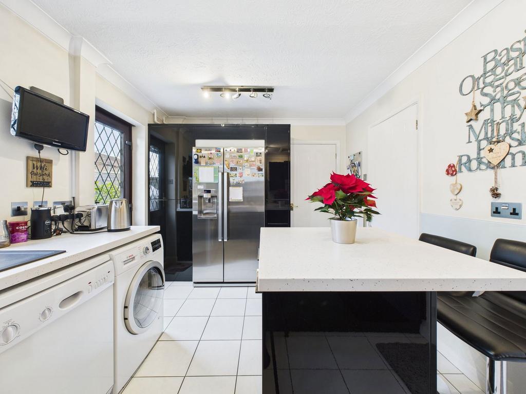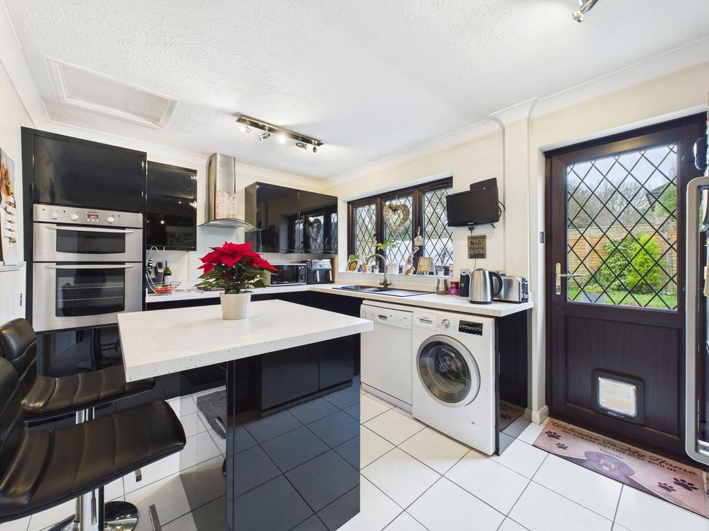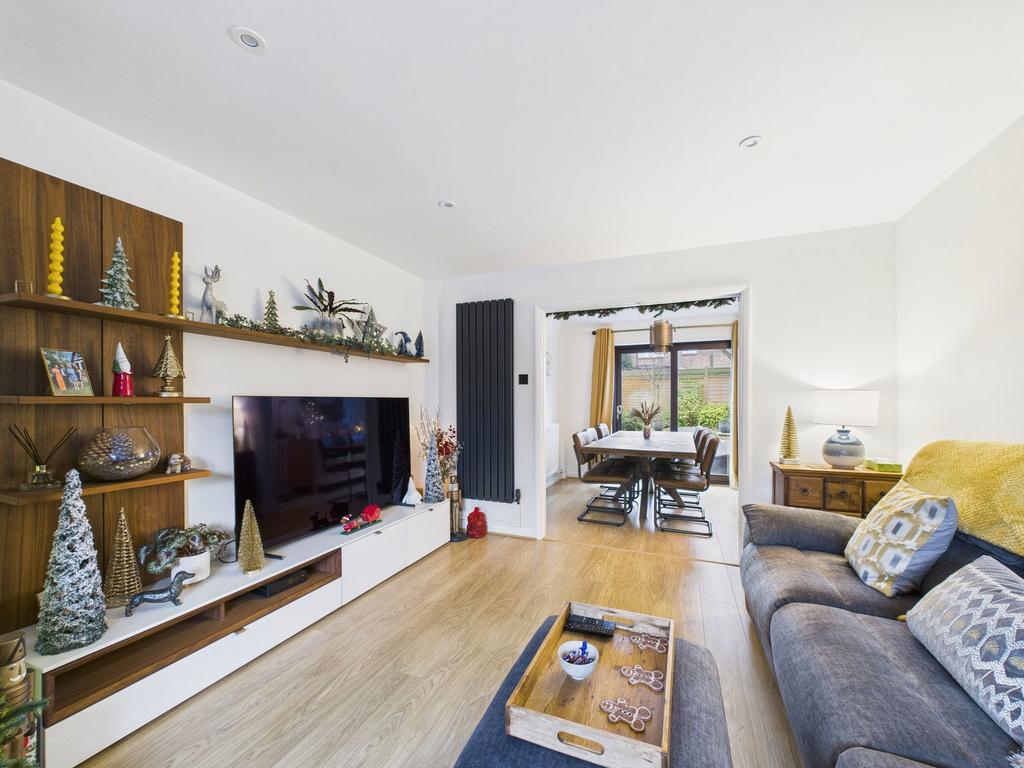 The front door opens into a welcoming entrance hall, providing access to the ground floor accommodation and a ground floor WC. There are two reception rooms with an open archway between them, with the second reception room featuring sliding doors leading out to the rear garden. The fitted kitchen is well-appointed with a range of wall and base units and benefits from a built-in double oven, gas hob, breakfast island, sink and drainer. There is space for an American-style fridge/freezer, dishwasher, and washing machine, along with a door providing direct access to the rear garden. To the first floor are three bedrooms, with the principal bedroom offering ample built-in wardrobes and access to an en-suite shower room. The en-suite comprises a shower cubicle, wash hand basin with illuminated sensor mirror, and WC. The family bathroom features a bath with shower attachment, wash hand basin with illuminated sensor mirror, and WC.