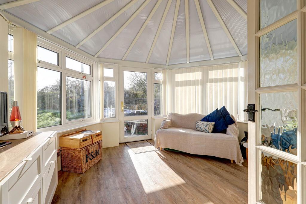 Double doors open from the dining room into the conservatory, which enjoys lovely views over the garden and open fields beyond, and provides direct access outside .
