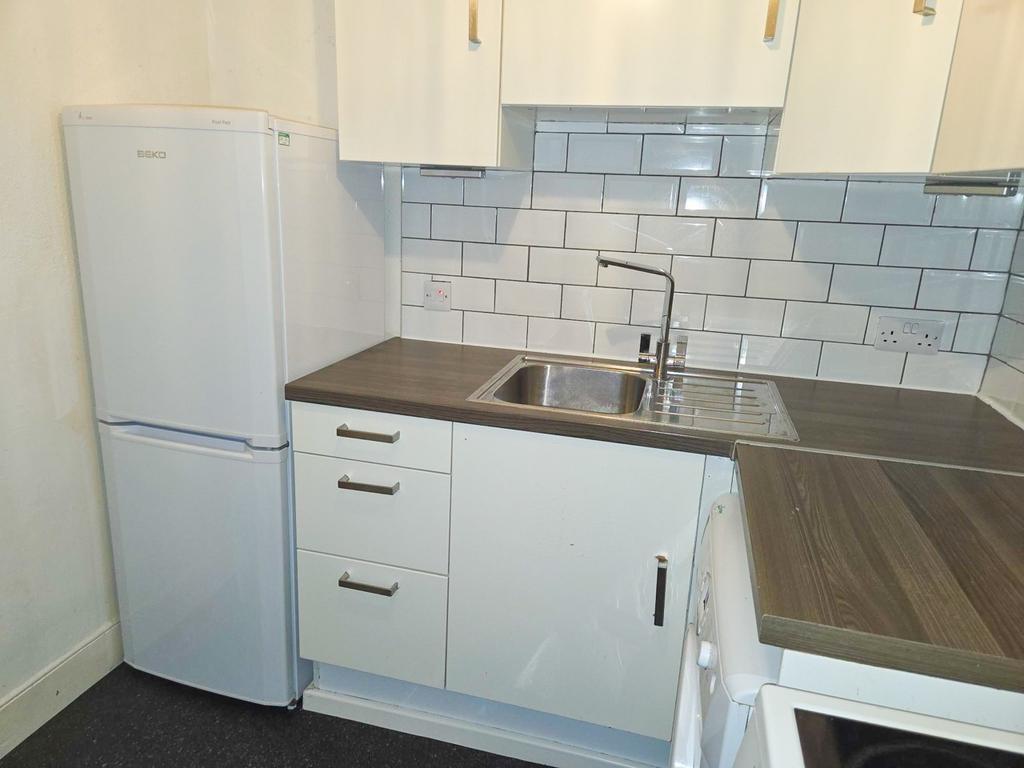 Gas boiler. Window to rear. Vinyl flooring. Fitted wall and basin units. Stainless steel sink. Tiled walls above worktops and cooker space.