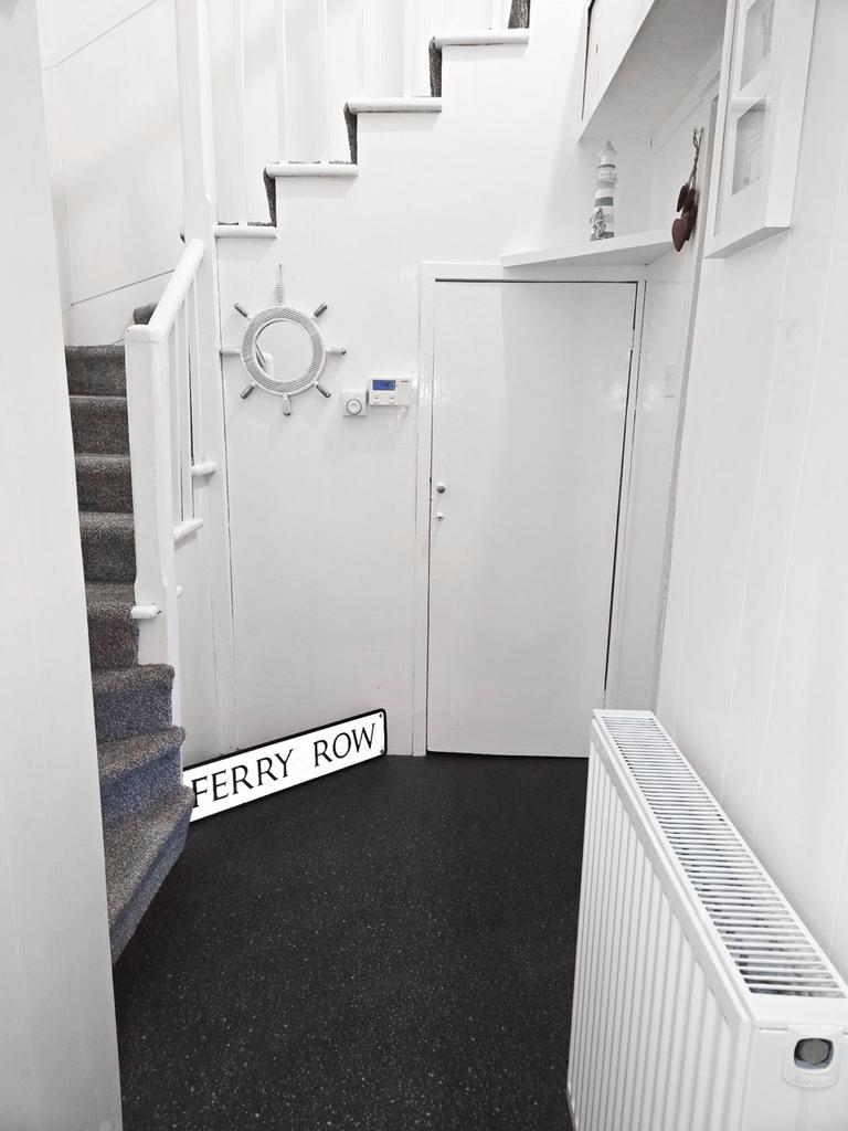 Front door enters into hallway. Hall has one understairs cupboard, a radiator and vinyl flooring.