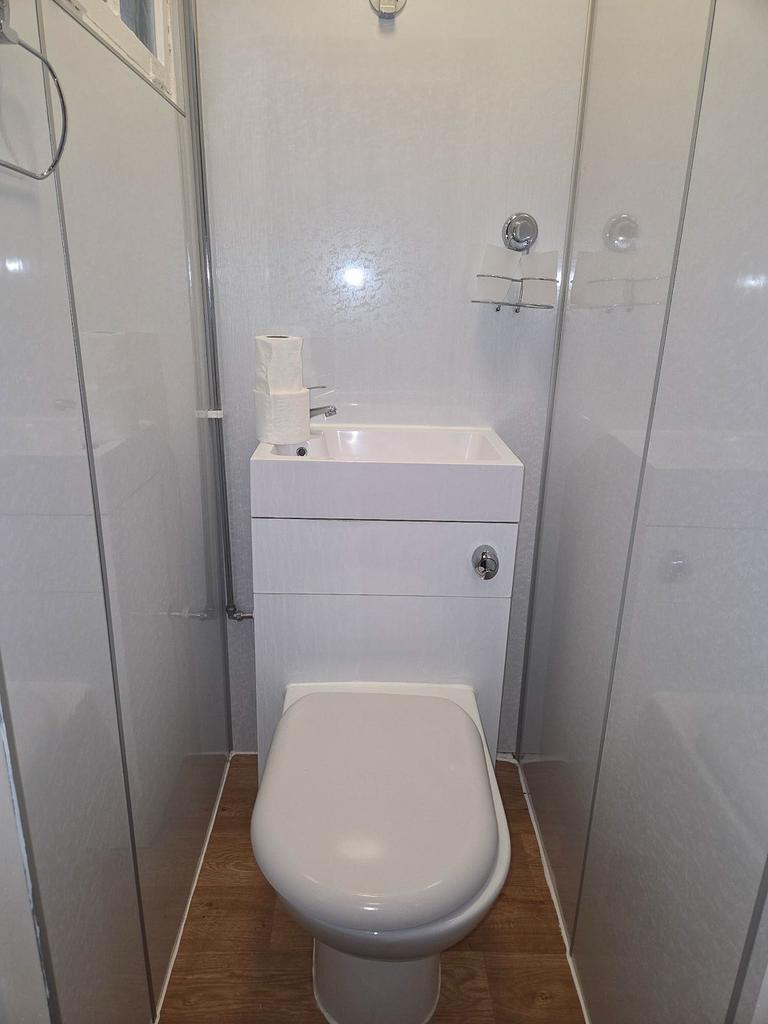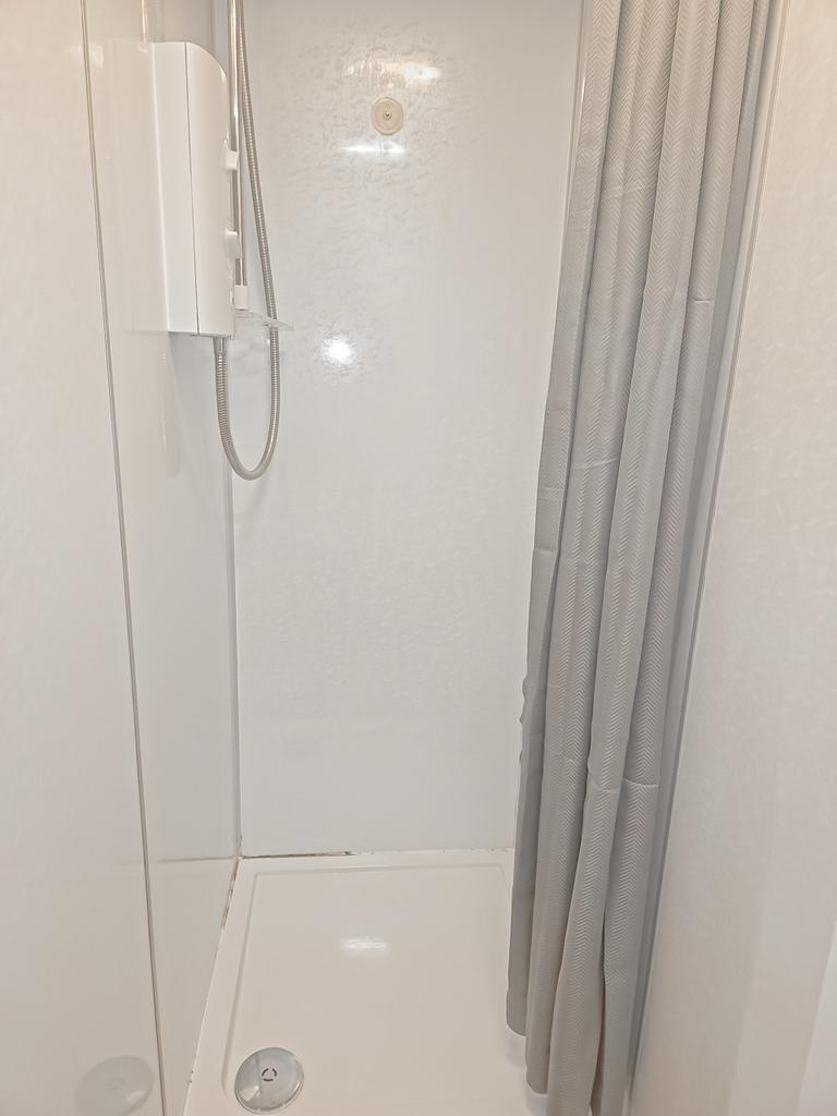 Shower cubicle with electric shower. Extractor fan. Vinyl flooring. Wet wall panels to all walls.