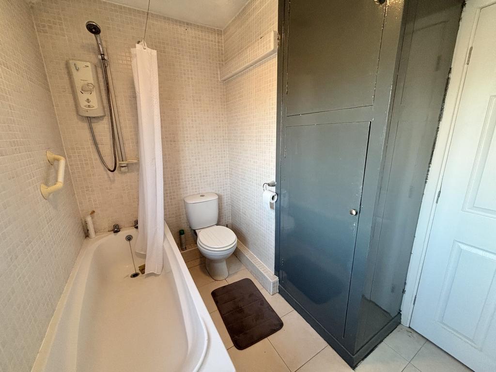 Bath with electric shower over, low flush wc, wash hand basin, radiator, storage cupboard, UPVC double glazed opaque window to the front aspect.