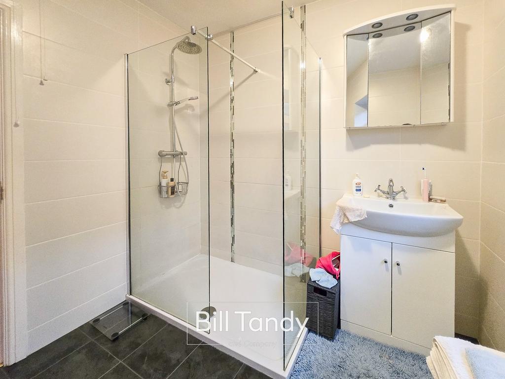 2.37m x 2.17m (7' 9" x 7' 1") having obscure double glazed window to side, chrome heated towel rail with radiator, updated suite comprising vanity unit with inset wash hand basin, low flush W.C. and shower cubicle with twin-headed shower appliance over, modern tiling with mosaic borders and LVT flooring.