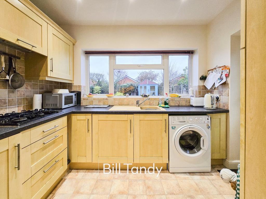 2.92m x 2.19m (9' 7" x 7' 2") having double glazed window overlooking the rear garden, obscure double glazed door to side, spotlighting, base cupboards and drawers with round edge work tops above, tiled surround, wall mounted cupboards, inset sink with drainer, inset Indesit double oven and grill, Electrolux gas hob with extractor fan above, integrated fridge/freezer and space for washing machine.