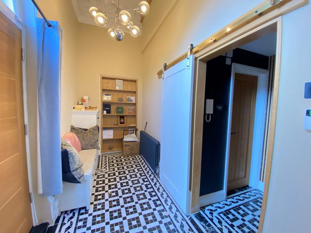 Old style radiator, mosaic tiled flooring meter cupboard, decorative coving, sliding door into:-