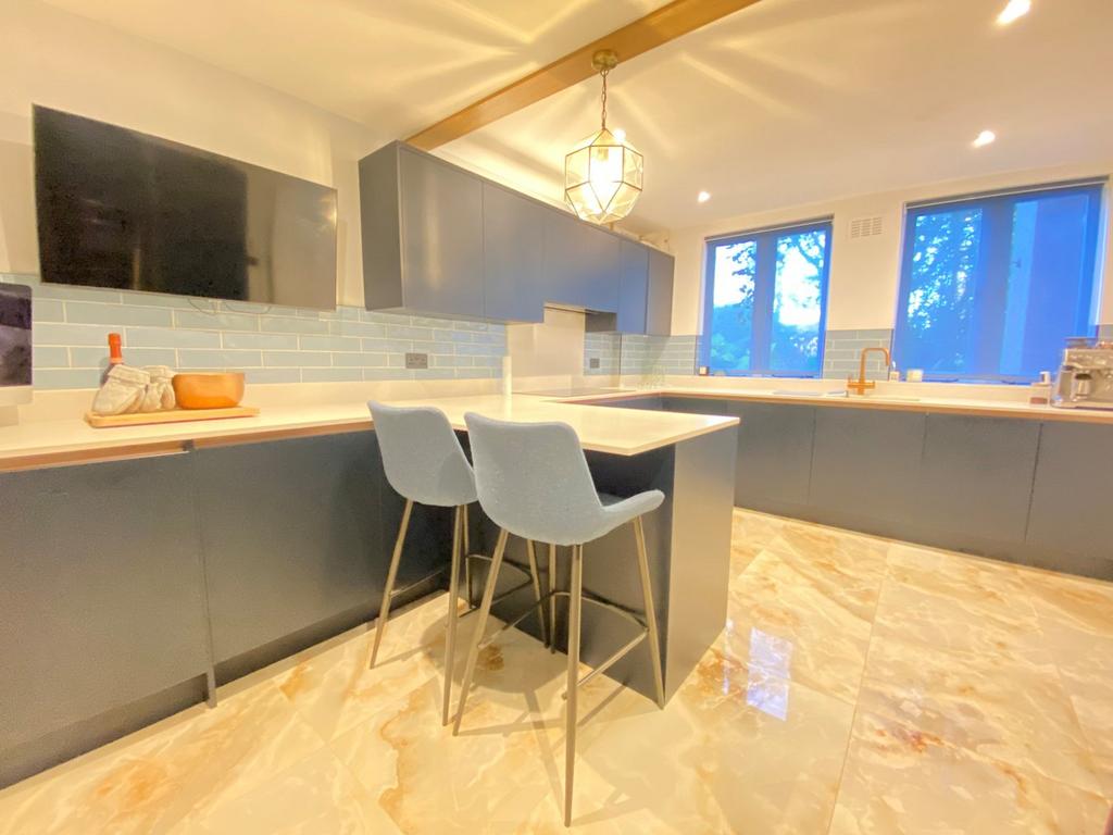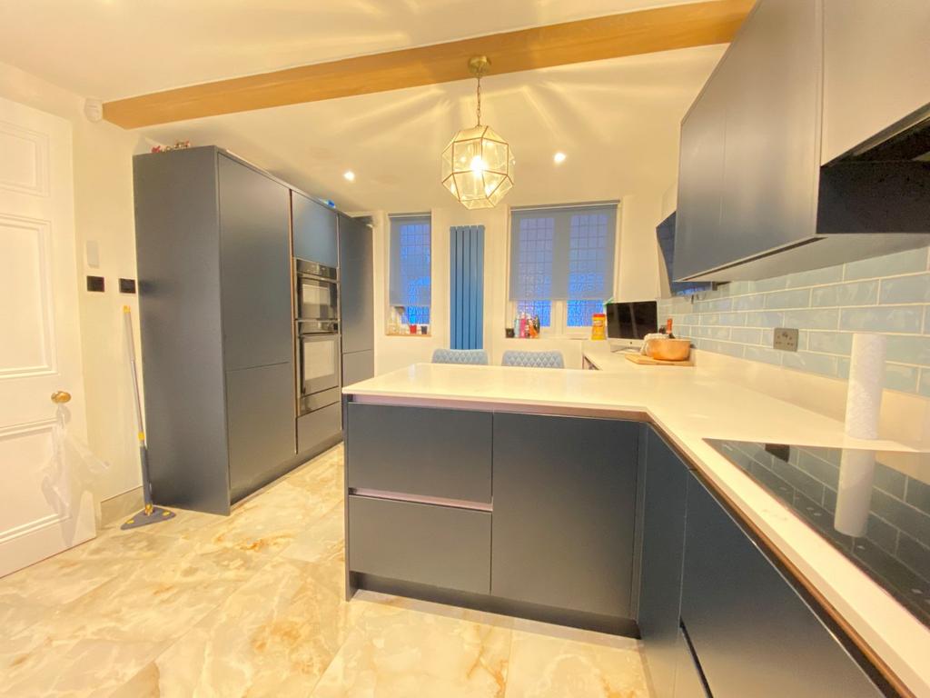 4.80m x 3.39m (15' 9" x 11' 1") Double glazed window to rear and side, range of fitted wall and base units, Neff induction hob, extractor hood, sink and mixer tap, double oven, microwave, integrated fridge/freezer, plate warmer, integrated washing machine and tumble dryer, heated flooring, tiled flooring, spot lights, upright radiator, drawer units.