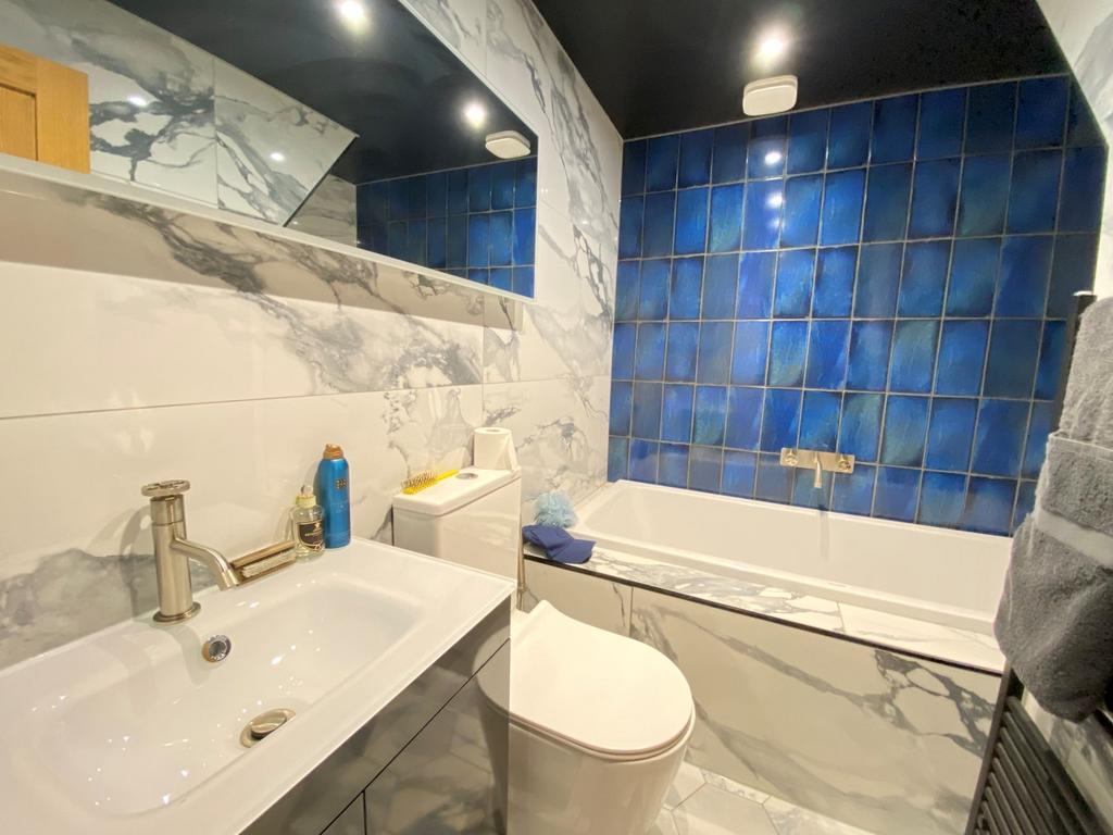 2.29m x 1.93m (7' 6" x 6' 4") Duravit double ended bath, tiled walls, wall mounted bath filler, low level w/c, wash hand basin and storage under, TU, spot lights, extractor fan, heated towel rail.