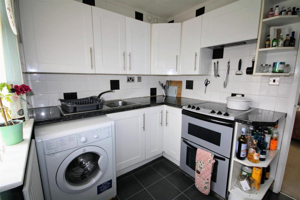 Kitchen - White fitted kitchen with contrasting worktops, tiled splash back, stainless steel sink and drainer, electric cooker, fridge freezer, washing machine, UPVC double glazed window, access to rear