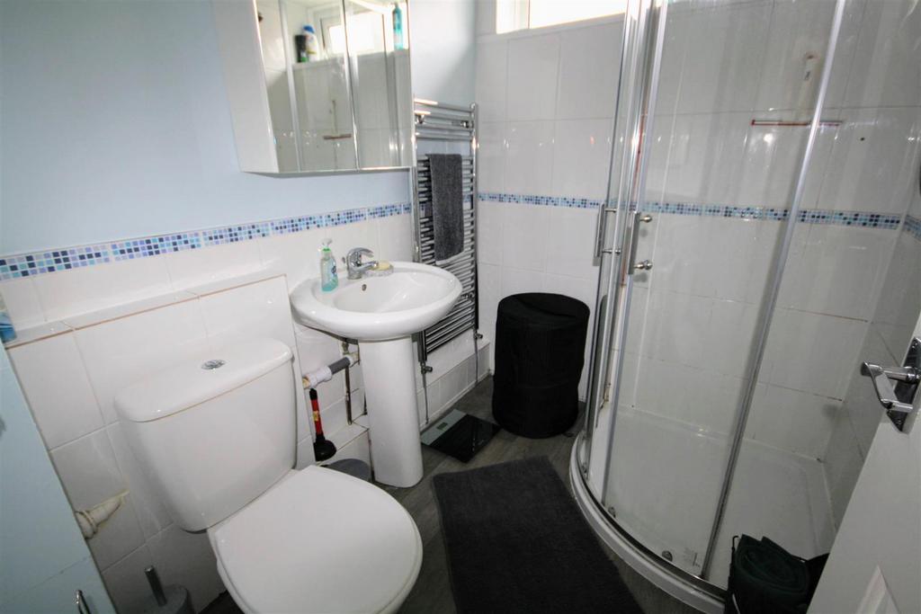 Bathroom - White suite with low level wc, pedestal hand basin, walk in corner shower cubicle, tiled splash back, heated towel rail