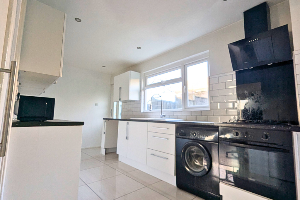 The ground floor is completed by a modern kitchen with plenty of storage and worktop space, featuring a built-in oven with gas hob, space for a fridge freezer and washing machine, plus an additional storage cupboard. From here, you have direct access to the rear garden, which is patio slabbed and ideal for outdoor dining and entertaining.