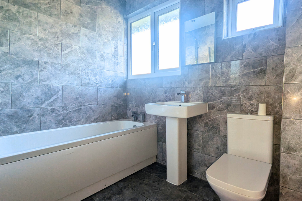 Upstairs are two generously sized double bedrooms and a modern house bathroom, complete with a shower over the bath, wash basin and WC, finished with a tiled floor and floor-to-ceiling tiles.