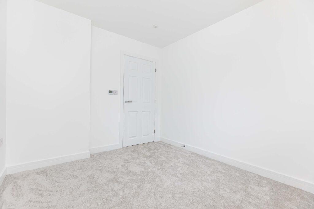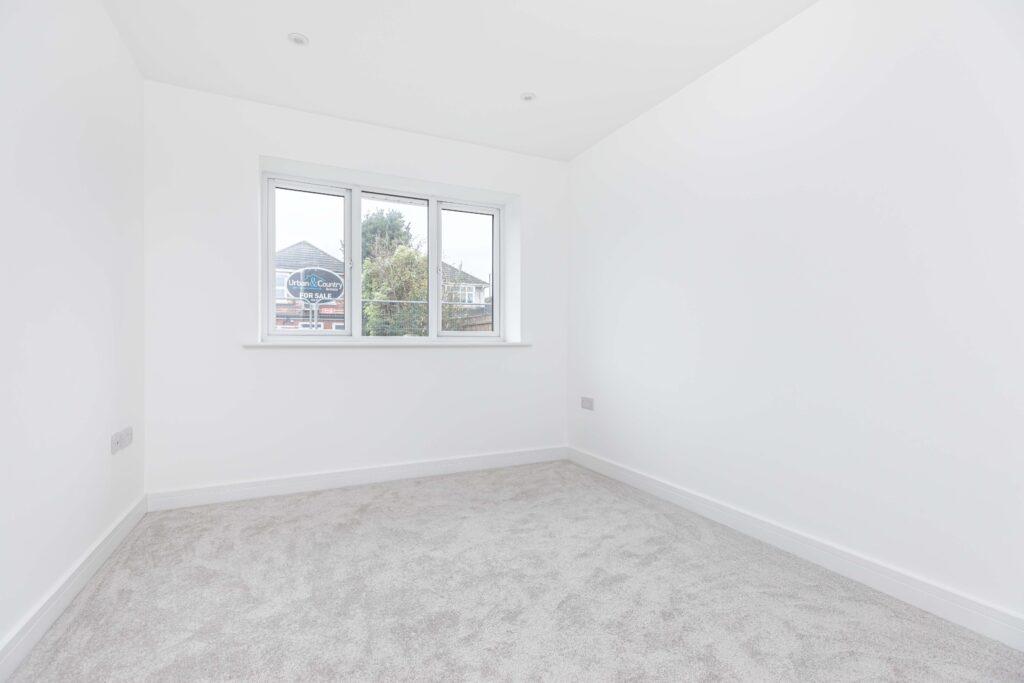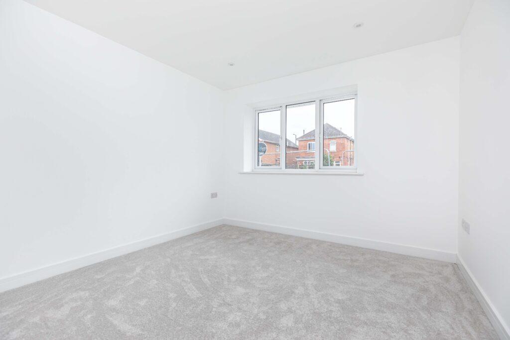 The second bedroom also overlooks the front of the property and is finished with light grey carpeting and white walls. This is another generously sized double room, offering ample space for a double bed along with additional bedroom furniture.