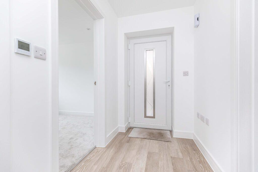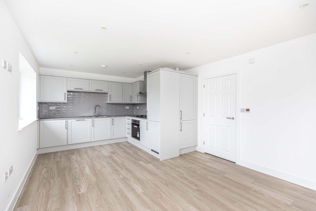 The space comfortably accommodates a dining table and also allows room for a sofa and TV, creating a versatile kitchen-living area. Both the kitchen and hallway are finished with light brown wood-effect laminate flooring and freshly painted white walls. A brand new Glow-worm combi boiler is also housed within the kitchen.