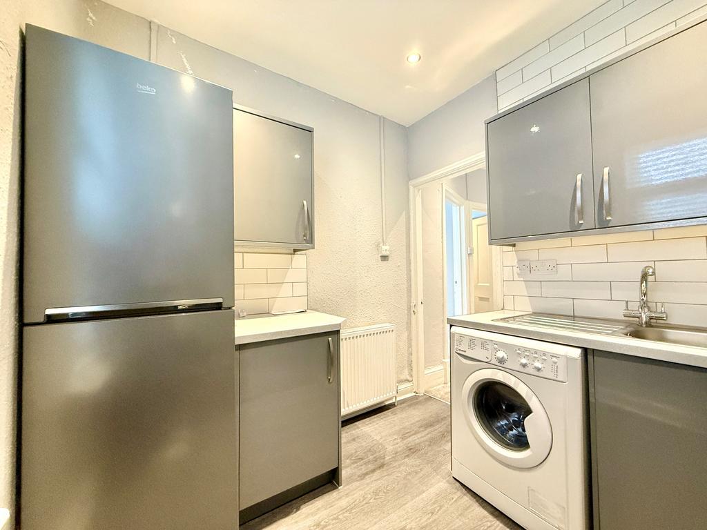 Tiled walls. Laminate flooring. Eye and base level units. Freestanding washing machine, oven/hob and fridge/freezer.