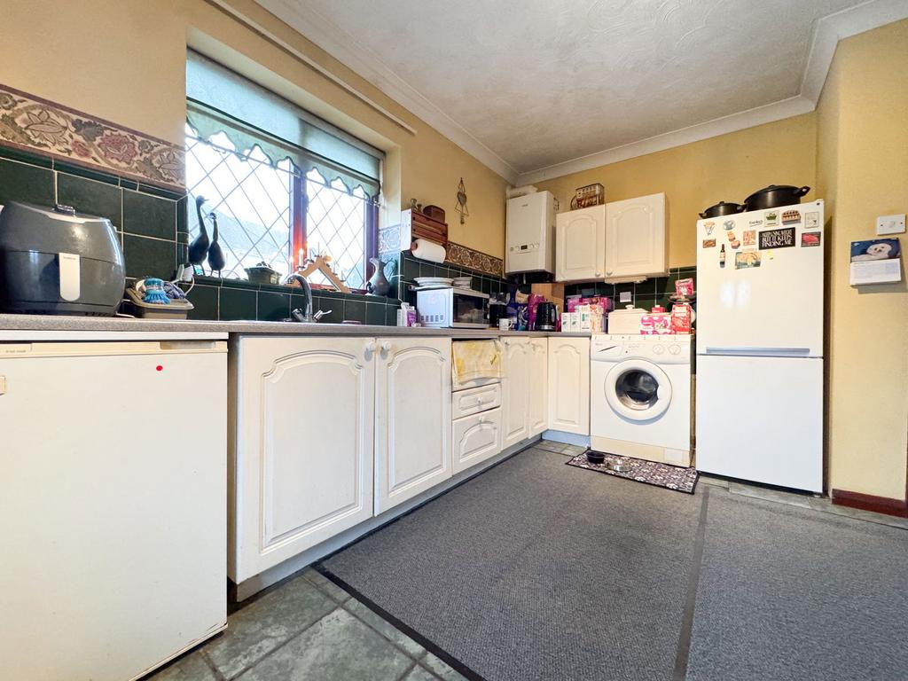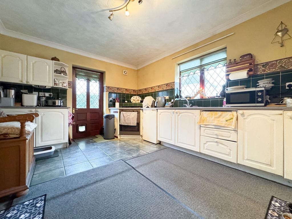 The kitchen is generously sized and thoughtfully arranged, providing an abundance of fitted cabinetry and extensive work surface space. It is well equipped with an integrated double oven, four-ring gas hob, plumbing for a washing machine, tiled splashbacks, tiled flooring, a double-panel radiator, door leading to the side of the property and fitted spot lighting, making it both functional and stylish.