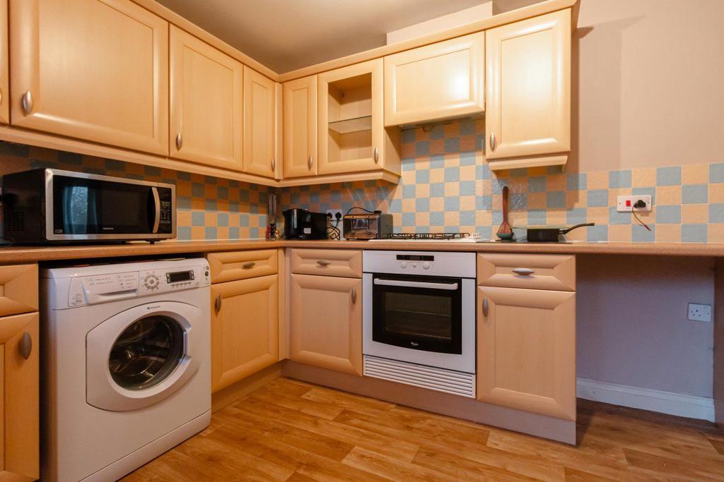 The dining room, located at the front of the property, features a box bay window and fitted carpet, making it a perfect space for entertaining or family meals. Adjacent to the dining room, the modern kitchen offers practicality and style. It is fitted with a range of base and wall units, complemented by matching worktops. The kitchen includes an integrated gas hob with an extractor fan, an electric oven, and space for a washing machine, under-counter fridge, and freezer. A half-glazed door provides direct access to the rear garden, while an understairs storage cupboard adds practicality.