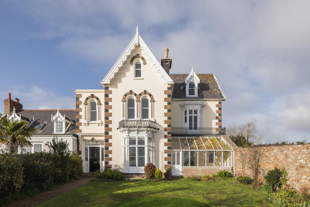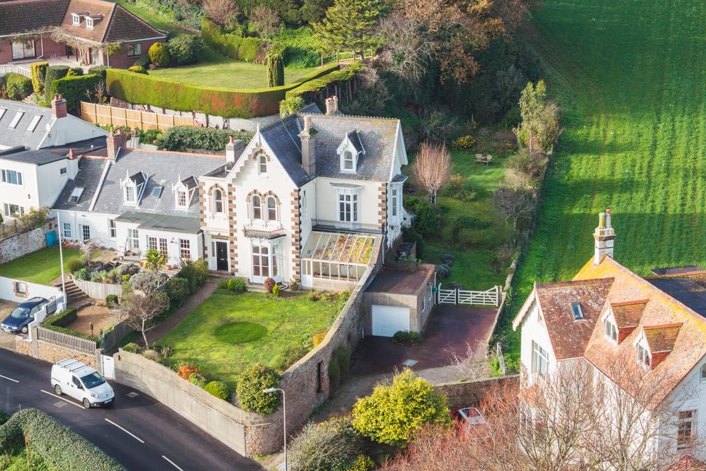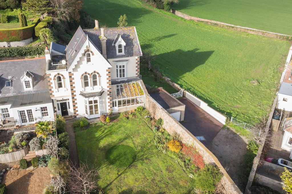 ENTITLED/LICENSED Le Chalet is an elegant Grade 2 listed home situated in the highly sought-after parish of St. Clement, enjoying elevated panoramic sea views and a wonderfully private outlook over open fields to the rear. The house is rich in character, featuring high ceilings, large south-facing windows that fill the rooms with natural light, and an array of charming period details throughout. The ground floor is arranged around a beautiful entrance hall with a tiled floor, leading to a drawing room, sitting room and a snug that opens into both the conservatory and the orangery. The kitchen connects seamlessly to a breakfast room and a separate utility room, creating a practical and welcoming flow for daily living. On the first floor, the primary bedroom benefits from its own dressing room, accompanied by two further well-sized double bedrooms and a stylish house bathroom. The top floor provides two additional double bedrooms along with an extra bathroom, making it ideal for guests or larger families.