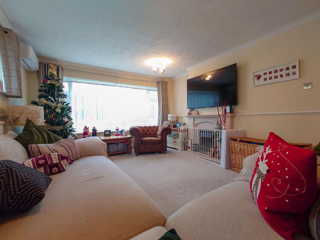 Unusually large and useful split level hall that flows through the property. Modern decorative front door composite door with obscured glazed panels either side. Wood effect flooring on the initial entrance area, leads to the reception areas. Large storage cupboard with additional row of overhead store cupboards. Radiator with slated cover. Several steps lead to the lower carpeted area leading to bedrooms. A large walk in cupboard (currently has tumble dryer etc) and houses the modern heating boiler.