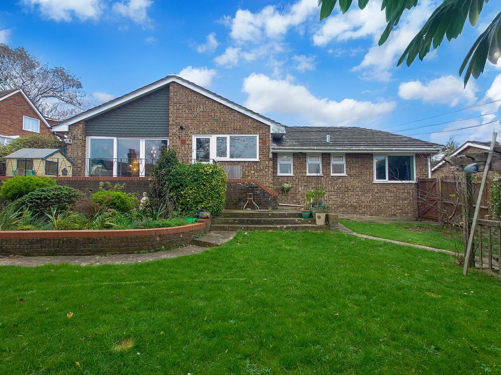 Rear Gardens: Raised patio area leading from house. Steps with pathways to garage, patio area and side access gate.