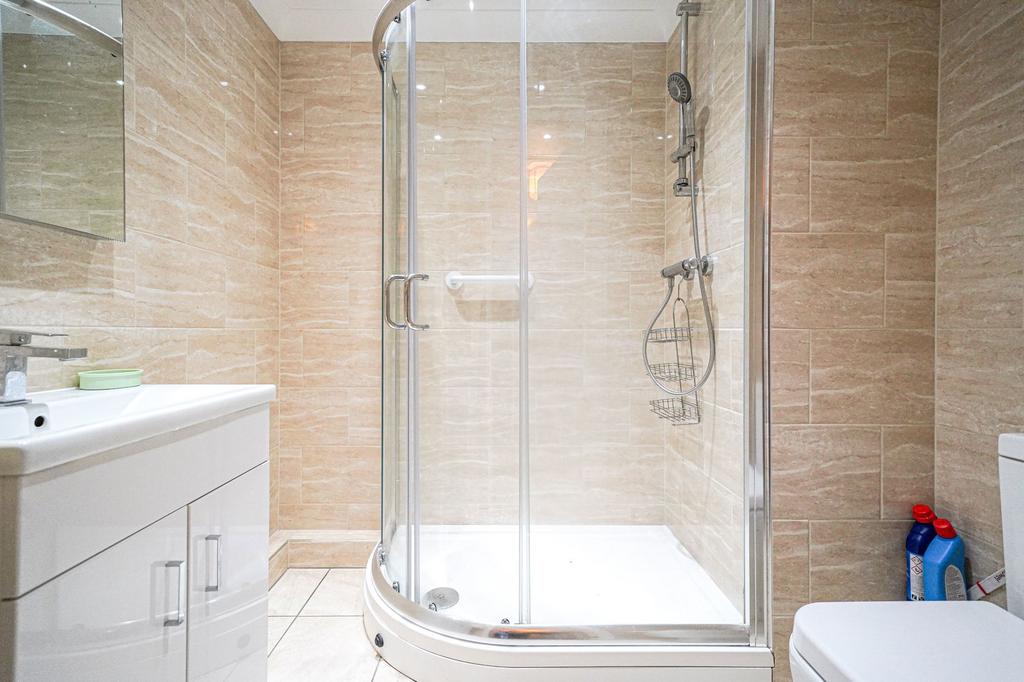 Being fitted with a white suite comprising a shower enclosure with wall mounted shower, low flush WC and vanity sink. Tiling to walls, tiled flooring, coving to ceiling, ceiling spot lights, extractor, heated towel rail and emergency pull-cord.