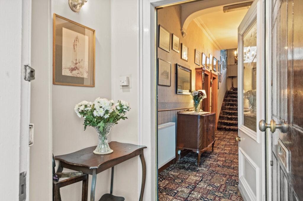 Positioned directly opposite the drawing room, the dining room also enjoys front-facing views. Features include carpet flooring, dado rail, cornicing, a marble fireplace with a living flame gas fire, and a radiator.